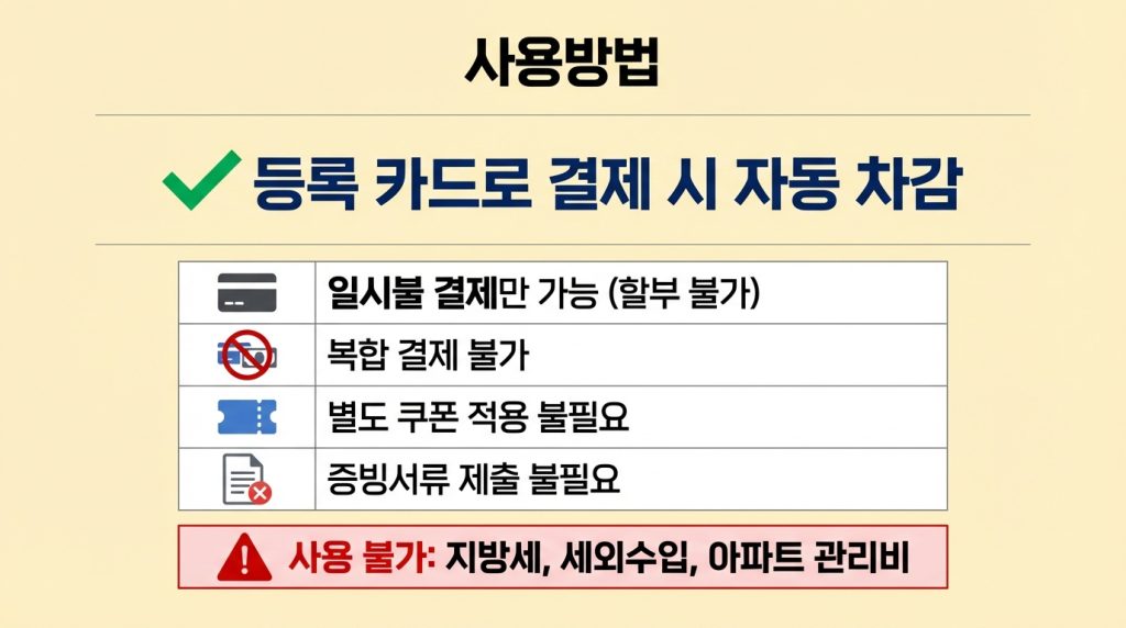 | 사용 방법 | 등록 카드로 결제 시 자동 차감, 일시불만 가능 |