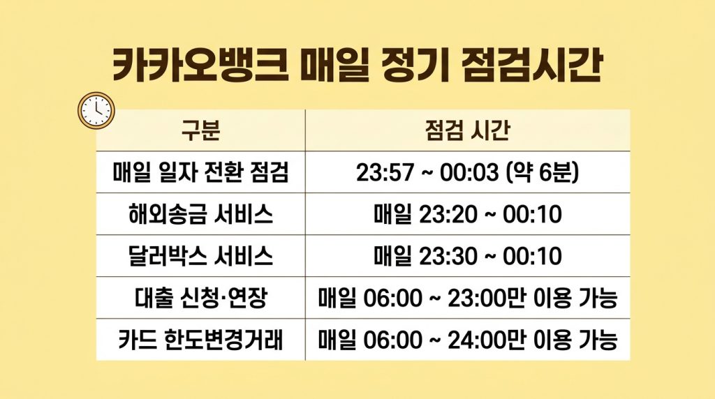 카카오뱅크는 대부분의 시간 동안 불편 없이 사용할 수 있지만, 자정 전후의 짧은 점검 구간과 연 1~2회의 대규모 정기점검 일정은 미리 파악해 두는 것이 자금 이동 계획을 세우는 데 도움이 됩니다.