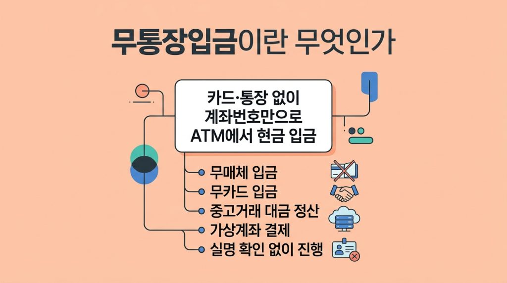 무통장입금은 카드나 통장 없이 계좌번호만 입력해 ATM에서 현금을 특정 계좌로 보내는 방식입니다. ‘무매체 입금’, ‘무카드 입금’이라고도 부르며, 이름은 다르지만 모두 같은 거래를 가리킵니다.